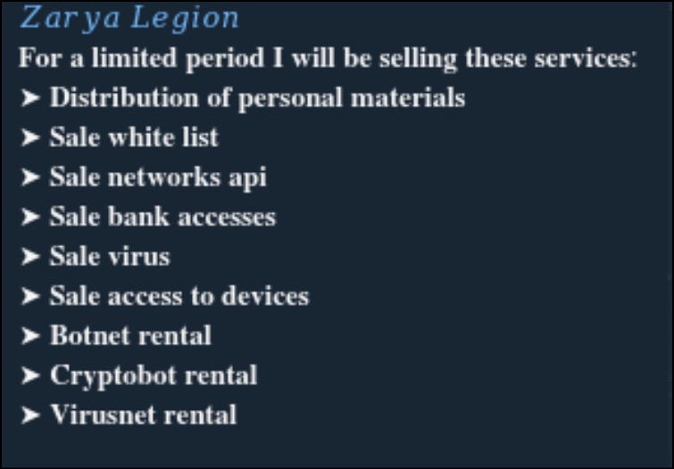For the first time Zarya Legion now offers their services for payment, really the usual offerings for most groups. What it might indicate is that after a long period they have been able to reestablish their product to now sell to customers.