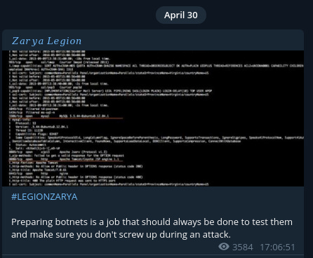 On April 30 Zarya Legion discusses testing their botnet to make sure it works during attacks. Despite the screenshot being hard to read, there is one part which provides capabilities - assuming this means bots in the botnet then the number appears to be 63487 - which would suggest the botnet has been growing.