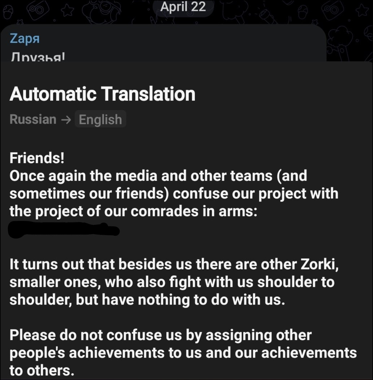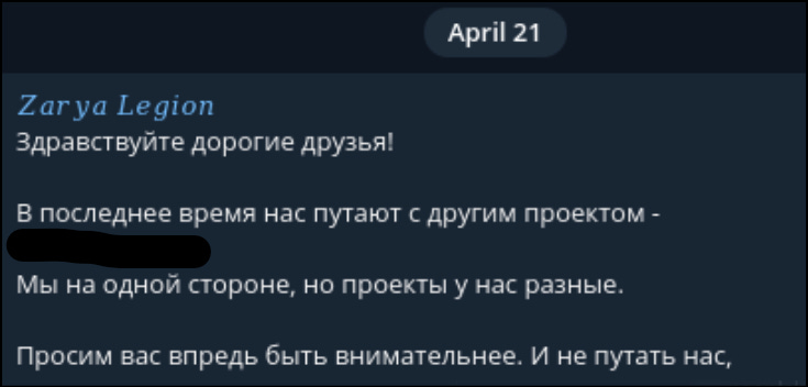 Translation: Hello dear friends! Lately we have been confused with another project Zarya. We are on the same side, but our projects are different. We ask you to be more careful in the future and don’t confuse us with other teams.