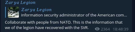 All this new activity once again comes to a stop in late April 2023 when the revelation is made via the leaked US documents that a ‘Zarya’ hacktivist group has attempted to sell Canadian company access to possible Russian intelligence members. Remember neither Zarya and Zarya Legion claim this.