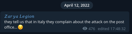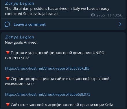 As you can see Killnet was not as happy about claiming any and all attacks as much when they started as they do now. To clarify that Killnet is talking about Zarya Legion and not Zarya - a review of Zarya activities shows they have never mentioned Italy. While Zarya Legion posted the following after the Killnet post.