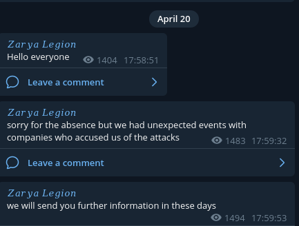 Zarya confirmed in April 2023 that they are separate to Zarya legion. They also importantly recognize Zarya Legion as a legitimate group. This is important as establishing the legitimacy of not well-documented groups can be difficult.