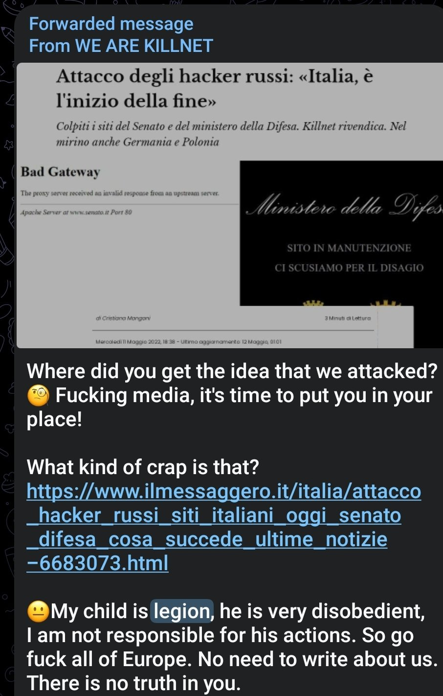 Now we have touched on that, let’s get into Zarya Legion. The only way we can confirm that Zarya Legion was actually related to Killnet (outside of Zarya Legion stating it) was in April 2022 when Killnet gets angry that they are being blamed for a Zarya Legion attack in Italian news. ( Zarya Legion did not claim to conduct the attack directly, but does recognize it after the event)