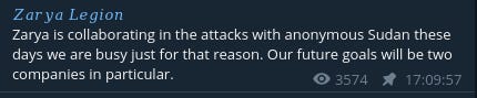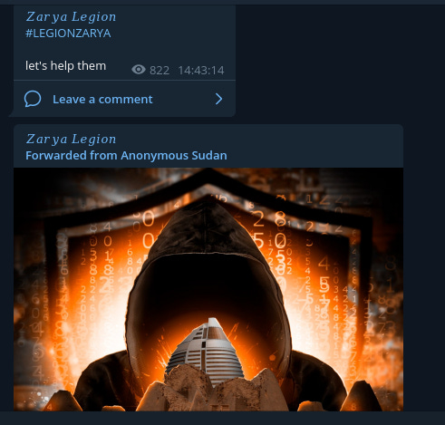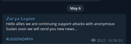 Zarya Legion repeats that they are supporting Anonymous Sudan attacks, the wording is worth noting, they always state they support Anonymous Sudan or support Killnet, not that they are conducting attacks for them.