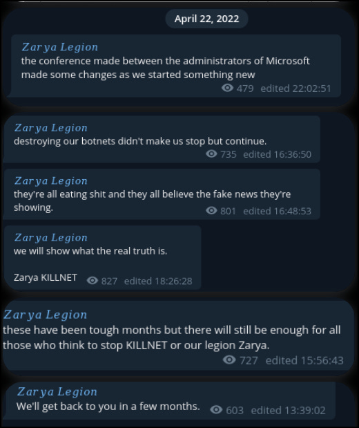Zarya Legion started on Telegram in March 2022, but by April 2022 they suffer some issues. As you will see below they discuss Microsoft and then complain about having their botnets destroyed. At this point they stop posting and do not post again until July 2022. This is a long period of silence for most pro-Russian hacktivist groups.