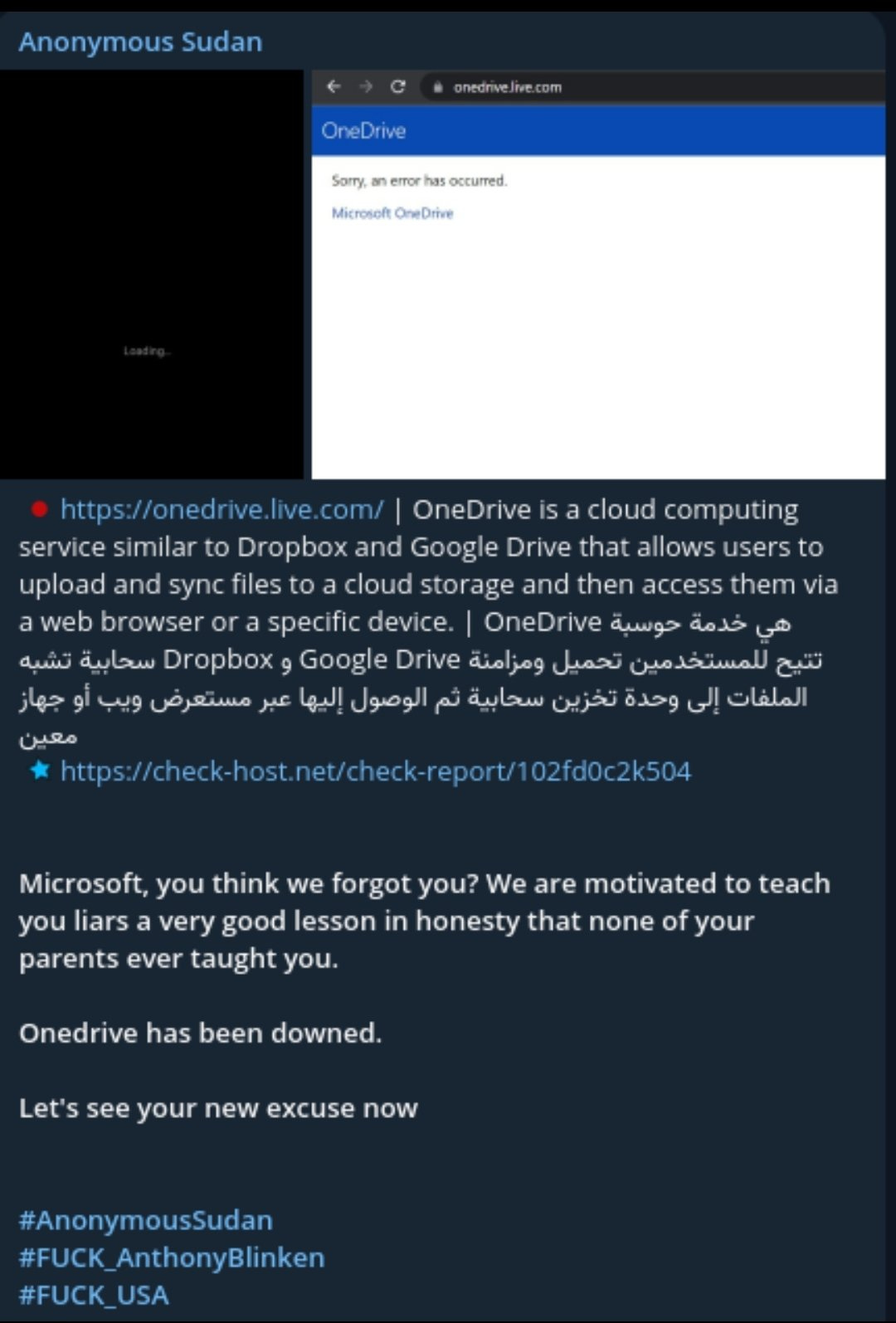 Anonymous Sudan posted something similar but with different wording. This would mark the first time that Zarya Legion would post a statement like this - It is unclear if they conducted this attack on Microsoft themselves or if they simply supported Anonymous Sudan. Below is the post that Anonymous Sudan put up relating to Microsoft lying about the attacks. You will note the differences.