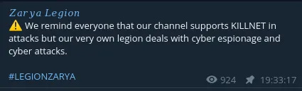 Zarya Legion then randomly clarifies that they support Killnet in attacks but conduct separate operations - this would explain why they don’t cross-promote or declare they are joining attacks. Once again Zarya Legion wants to distance themselves from public exposure and highlight they operate in the shadows.