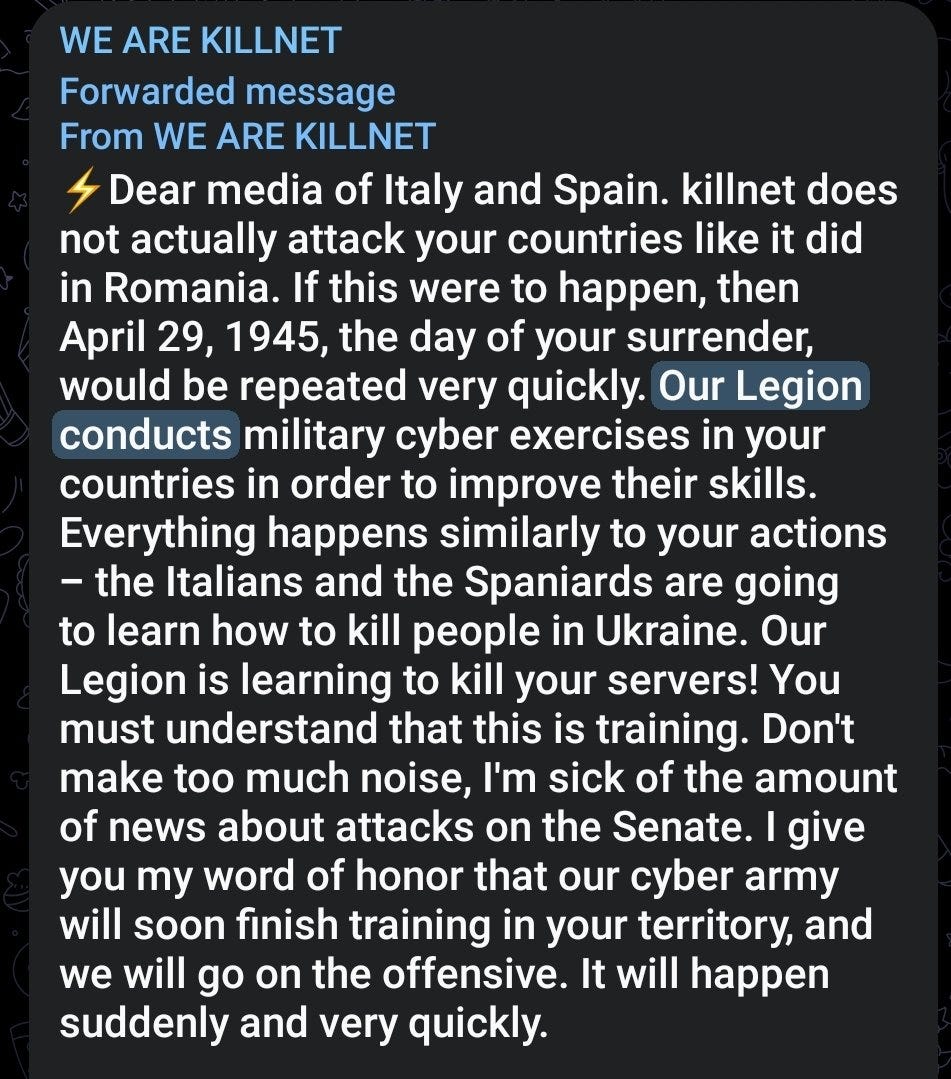Killnet does not claim the attacks as they do others, instead they speak of their ‘Legion’ this is the same way they referenced Zarya Legion in 2022.