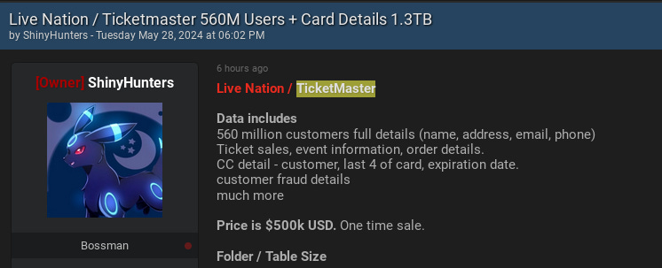 Firstly, it looks like Shinyhunters has stolen the post about Ticketmaster from another user that has posted it to Exploit - or, Shinyhunters has shared the alleged data to both forums. But, this would undermine BreachForums as the go to option so it seems unlikely. The first image below is the post by Shinyhunters on BreachForums and the second image is a post on Exploit Forum from a user called 'Spiderman' You will note they are identical - making it questionable about the legitimacy of the hefty claim that it is 1.3tb of data. Both the posts share the same data evidence.